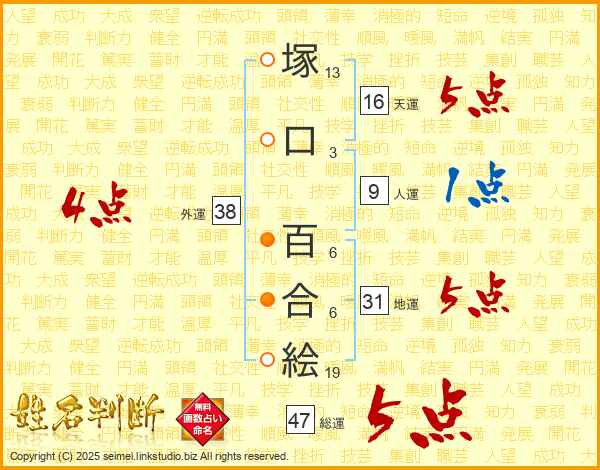 生活面を象徴する運勢です。外部から受ける影響力を表し、結婚運、家庭運や職場、環境への順応性を表します。総運から人運を引いた画数。姓や名が1文字の場合を除く。