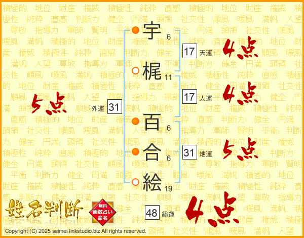 宇(6画)梶(11画) 百(6画)合(6画)絵(19画)