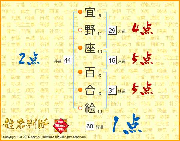 宜(8画)野(11画)座(10画) 百(6画)合(6画)絵(19画)