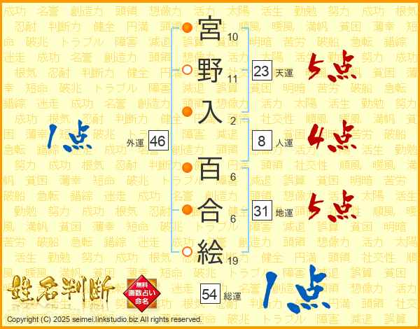 宮(10画)野(11画)入(2画) 百(6画)合(6画)絵(19画)