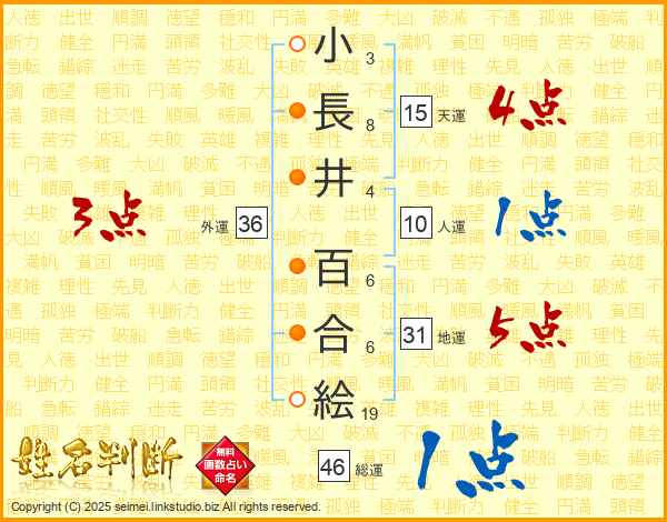 生活面を象徴する運勢です。外部から受ける影響力を表し、結婚運、家庭運や職場、環境への順応性を表します。総運から人運を引いた画数。姓や名が1文字の場合を除く。
