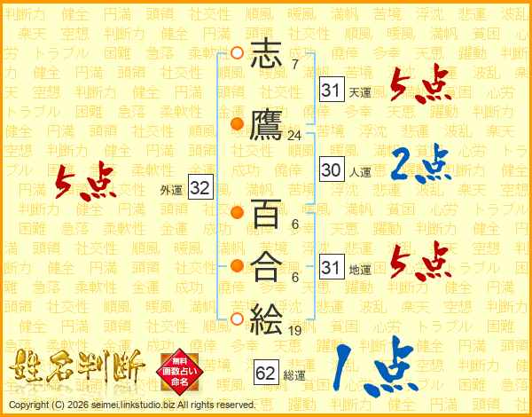 志(7画)鷹(24画) 百(6画)合(6画)絵(19画)