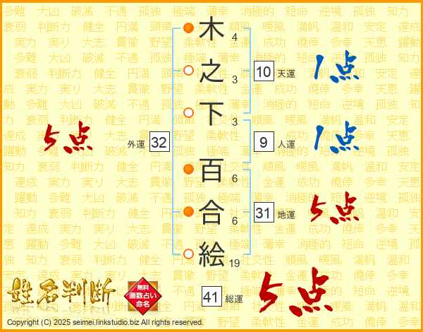 木之下百合絵さんの総運は41画の5点!