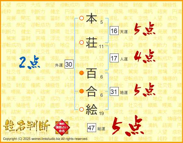 本(5画)荘(11画) 百(6画)合(6画)絵(19画)
