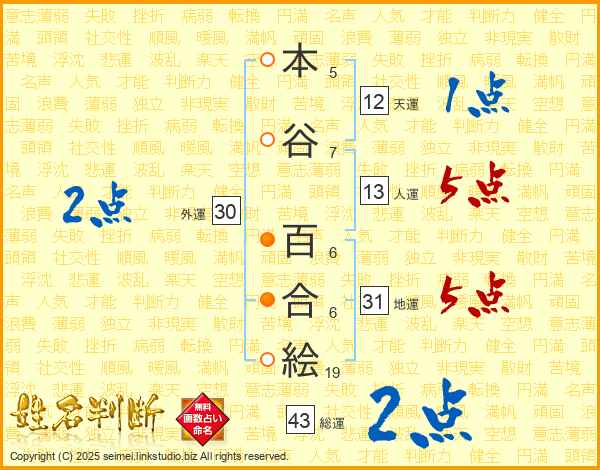生活面を象徴する運勢です。外部から受ける影響力を表し、結婚運、家庭運や職場、環境への順応性を表します。総運から人運を引いた画数。姓や名が1文字の場合を除く。