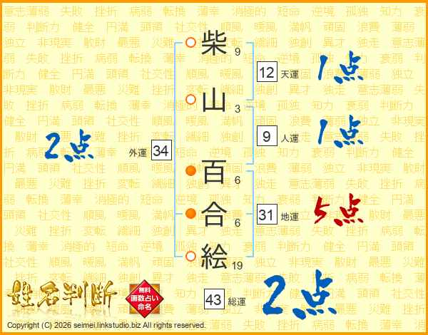 生活面を象徴する運勢です。外部から受ける影響力を表し、結婚運、家庭運や職場、環境への順応性を表します。総運から人運を引いた画数。姓や名が1文字の場合を除く。