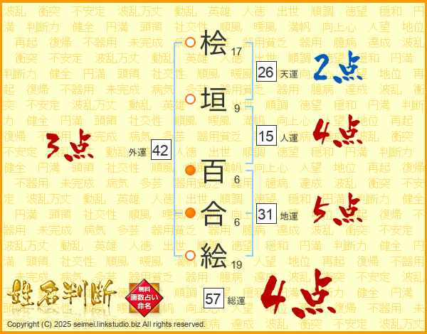 桧(17画)垣(9画) 百(6画)合(6画)絵(19画)