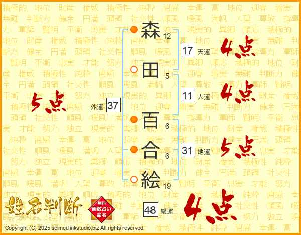 生活面を象徴する運勢です。外部から受ける影響力を表し、結婚運、家庭運や職場、環境への順応性を表します。総運から人運を引いた画数。姓や名が1文字の場合を除く。