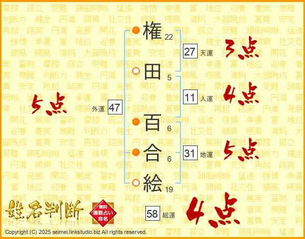 生活面を象徴する運勢です。外部から受ける影響力を表し、結婚運、家庭運や職場、環境への順応性を表します。総運から人運を引いた画数。姓や名が1文字の場合を除く。