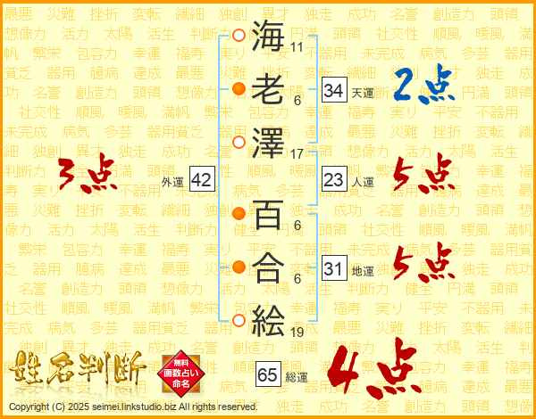 海(11画)老(6画)澤(17画) 百(6画)合(6画)絵(19画)