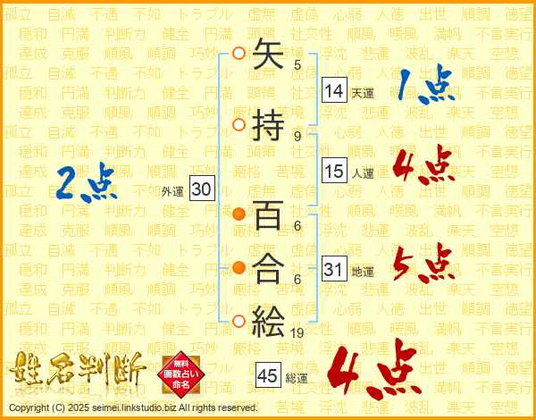 生活面を象徴する運勢です。外部から受ける影響力を表し、結婚運、家庭運や職場、環境への順応性を表します。総運から人運を引いた画数。姓や名が1文字の場合を除く。