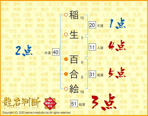 稲(15画)生(5画) 百(6画)合(6画)絵(19画)