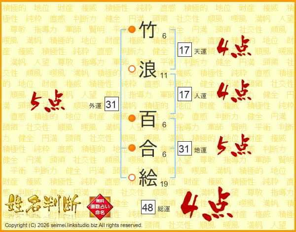 竹(6画)浪(11画) 百(6画)合(6画)絵(19画)