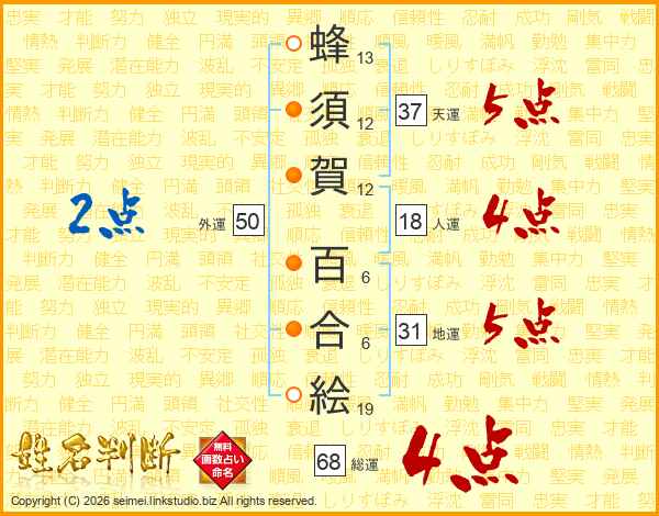 蜂(13画)須(12画)賀(12画) 百(6画)合(6画)絵(19画)