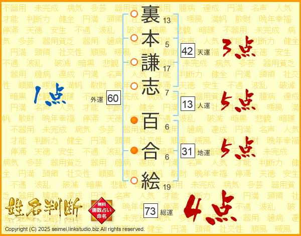 裏本謙志百合絵さんの人運は13画の5点!
