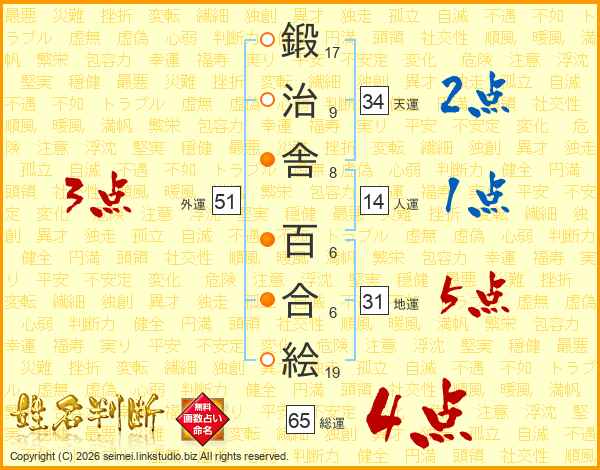 生活面を象徴する運勢です。外部から受ける影響力を表し、結婚運、家庭運や職場、環境への順応性を表します。総運から人運を引いた画数。姓や名が1文字の場合を除く。