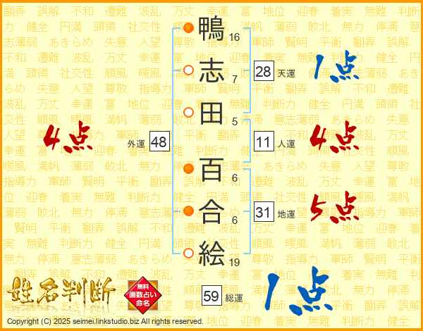 鴨(16画)志(7画)田(5画) 百(6画)合(6画)絵(19画)