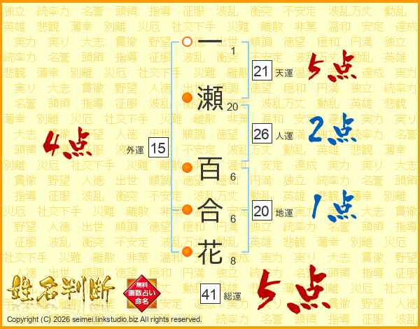 一(1画)瀬(20画) 百(6画)合(6画)花(8画)