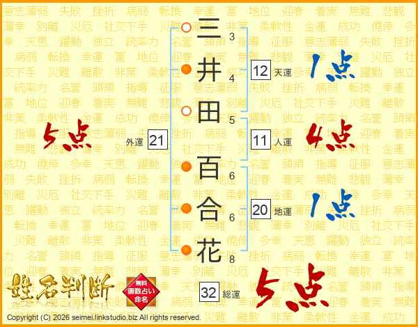 生活面を象徴する運勢です。外部から受ける影響力を表し、結婚運、家庭運や職場、環境への順応性を表します。総運から人運を引いた画数。姓や名が1文字の場合を除く。