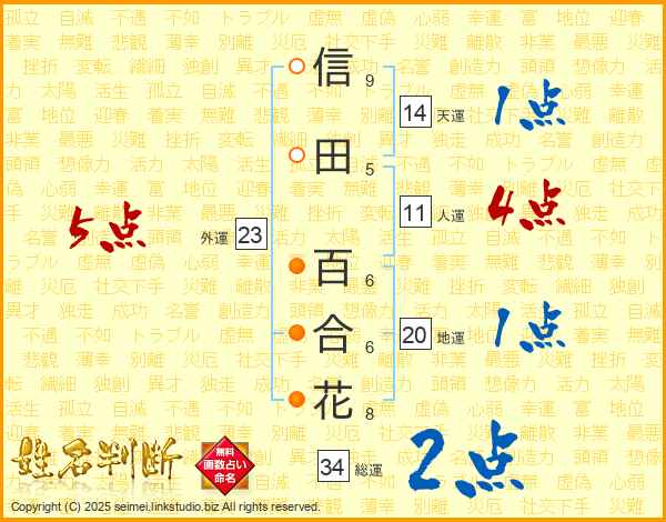 信(9画)田(5画) 百(6画)合(6画)花(8画)