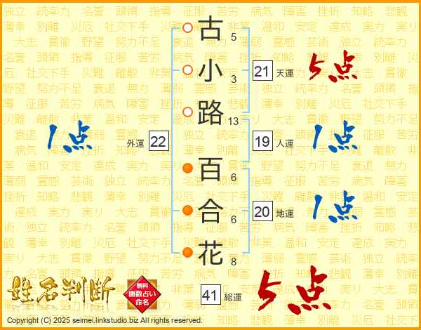 あなたの人生を表す1番重要な運勢です。生涯を通じて影響する総合運となり、主に50歳以降の晩年期に影響を及ぼします。苗字と名前の合計画数。