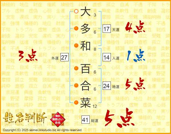 生活面を象徴する運勢です。外部から受ける影響力を表し、結婚運、家庭運や職場、環境への順応性を表します。総運から人運を引いた画数。姓や名が1文字の場合を除く。