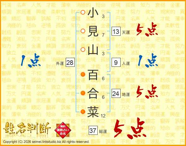 小(3画)見(7画)山(3画) 百(6画)合(6画)菜(12画)