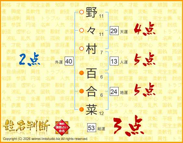 野(11画)々(11画)村(7画) 百(6画)合(6画)菜(12画)