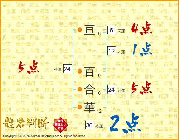 生活面を象徴する運勢です。外部から受ける影響力を表し、結婚運、家庭運や職場、環境への順応性を表します。総運から人運を引いた画数。姓や名が1文字の場合を除く。