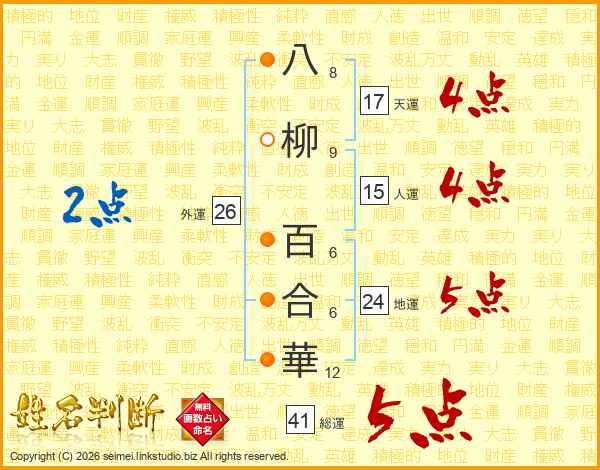 生活面を象徴する運勢です。外部から受ける影響力を表し、結婚運、家庭運や職場、環境への順応性を表します。総運から人運を引いた画数。姓や名が1文字の場合を除く。