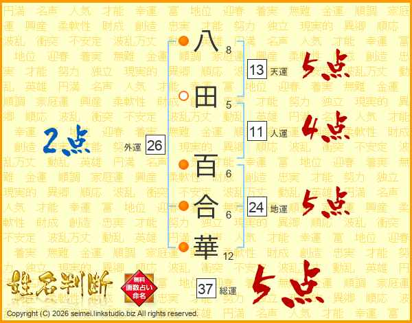 八(8画)田(5画) 百(6画)合(6画)華(12画)