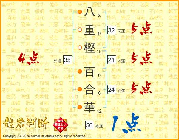 八(8画)重(9画)樫(15画) 百(6画)合(6画)華(12画)