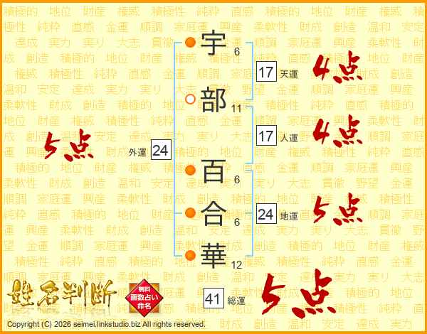 宇(6画)部(11画) 百(6画)合(6画)華(12画)