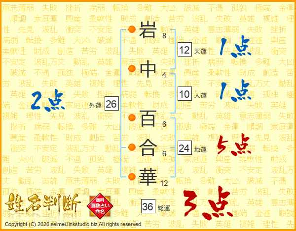 岩(8画)中(4画) 百(6画)合(6画)華(12画)