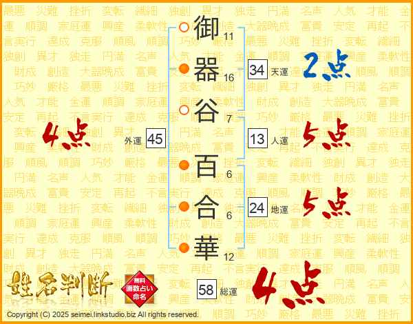 御(11画)器(16画)谷(7画) 百(6画)合(6画)華(12画)