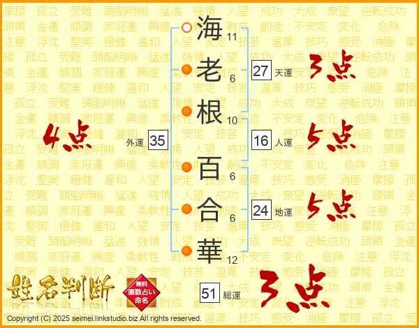 海(11画)老(6画)根(10画) 百(6画)合(6画)華(12画)