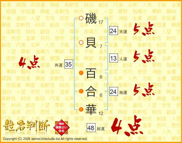 磯貝百合華さんの天運は24画の5点!