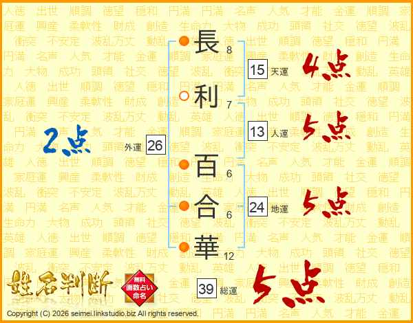 長(8画)利(7画) 百(6画)合(6画)華(12画)