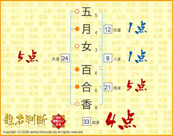 五(5画)月(4画)女(3画) 百(6画)合(6画)香(9画)