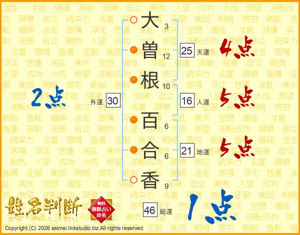 大(3画)曽(12画)根(10画) 百(6画)合(6画)香(9画)