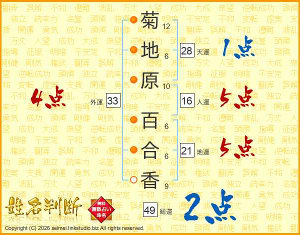 菊(12画)地(6画)原(10画) 百(6画)合(6画)香(9画)