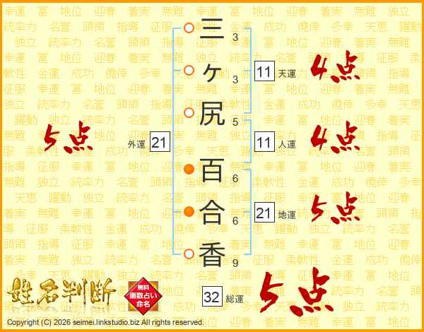 生活面を象徴する運勢です。外部から受ける影響力を表し、結婚運、家庭運や職場、環境への順応性を表します。総運から人運を引いた画数。姓や名が1文字の場合を除く。