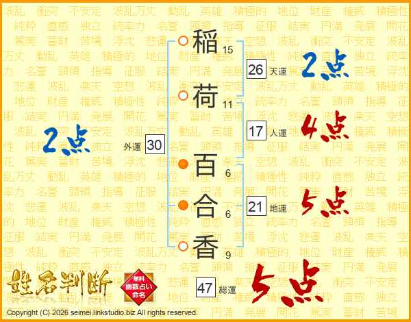 稲(15画)荷(11画) 百(6画)合(6画)香(9画)