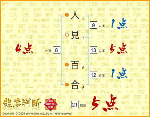 生活面を象徴する運勢です。外部から受ける影響力を表し、結婚運、家庭運や職場、環境への順応性を表します。総運から人運を引いた画数。姓や名が1文字の場合を除く。