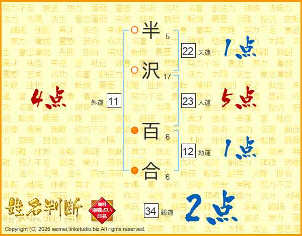 半沢百合さんの人運は23画の5点!