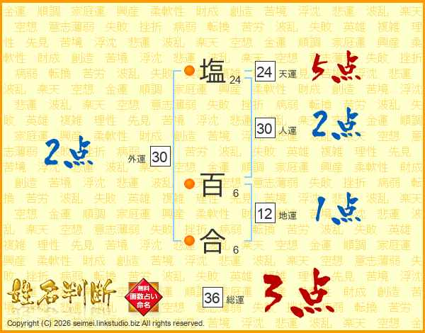 生活面を象徴する運勢です。外部から受ける影響力を表し、結婚運、家庭運や職場、環境への順応性を表します。総運から人運を引いた画数。姓や名が1文字の場合を除く。