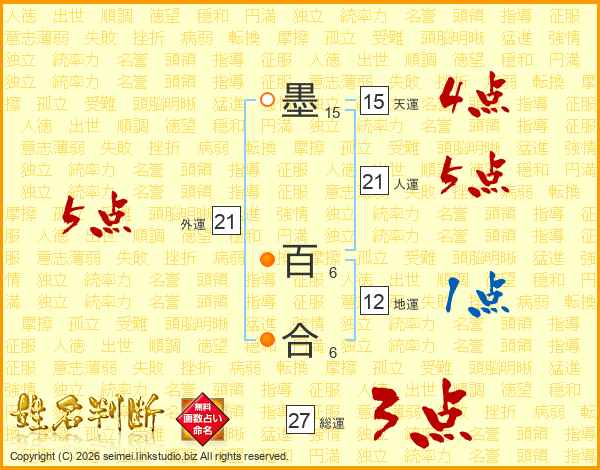 あなたの人生を表す1番重要な運勢です。生涯を通じて影響する総合運となり、主に50歳以降の晩年期に影響を及ぼします。苗字と名前の合計画数。