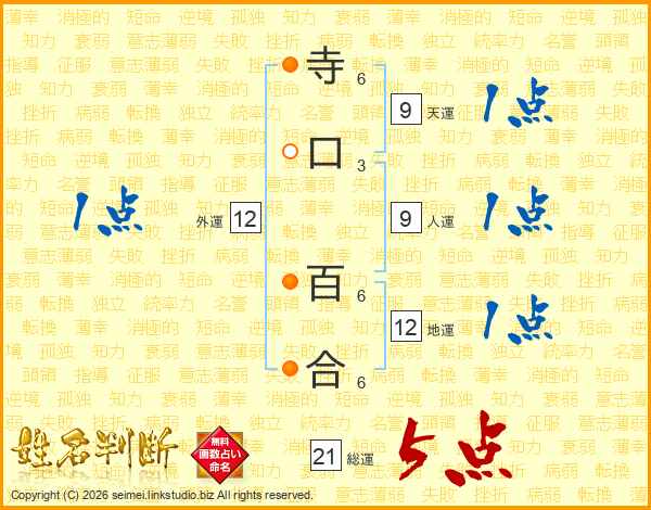 生活面を象徴する運勢です。外部から受ける影響力を表し、結婚運、家庭運や職場、環境への順応性を表します。総運から人運を引いた画数。姓や名が1文字の場合を除く。