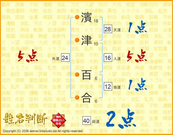 あなたの人生を表す1番重要な運勢です。生涯を通じて影響する総合運となり、主に50歳以降の晩年期に影響を及ぼします。苗字と名前の合計画数。