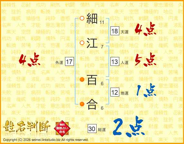あなたの人生を表す1番重要な運勢です。生涯を通じて影響する総合運となり、主に50歳以降の晩年期に影響を及ぼします。苗字と名前の合計画数。